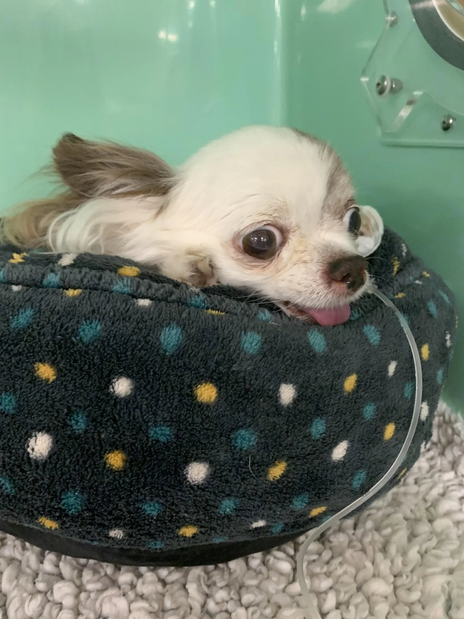 September 14th (Day 5 Post-op). When we went to visit Chockie the nurse told us they had put him in oxygen overnight because his respiratory rate was high but had weaned him off that morning and he was back in the ICU. He ate a little bit for us but his respiratory rate still seemed very high, he seemed very tired but could not get comfortable to lay.
