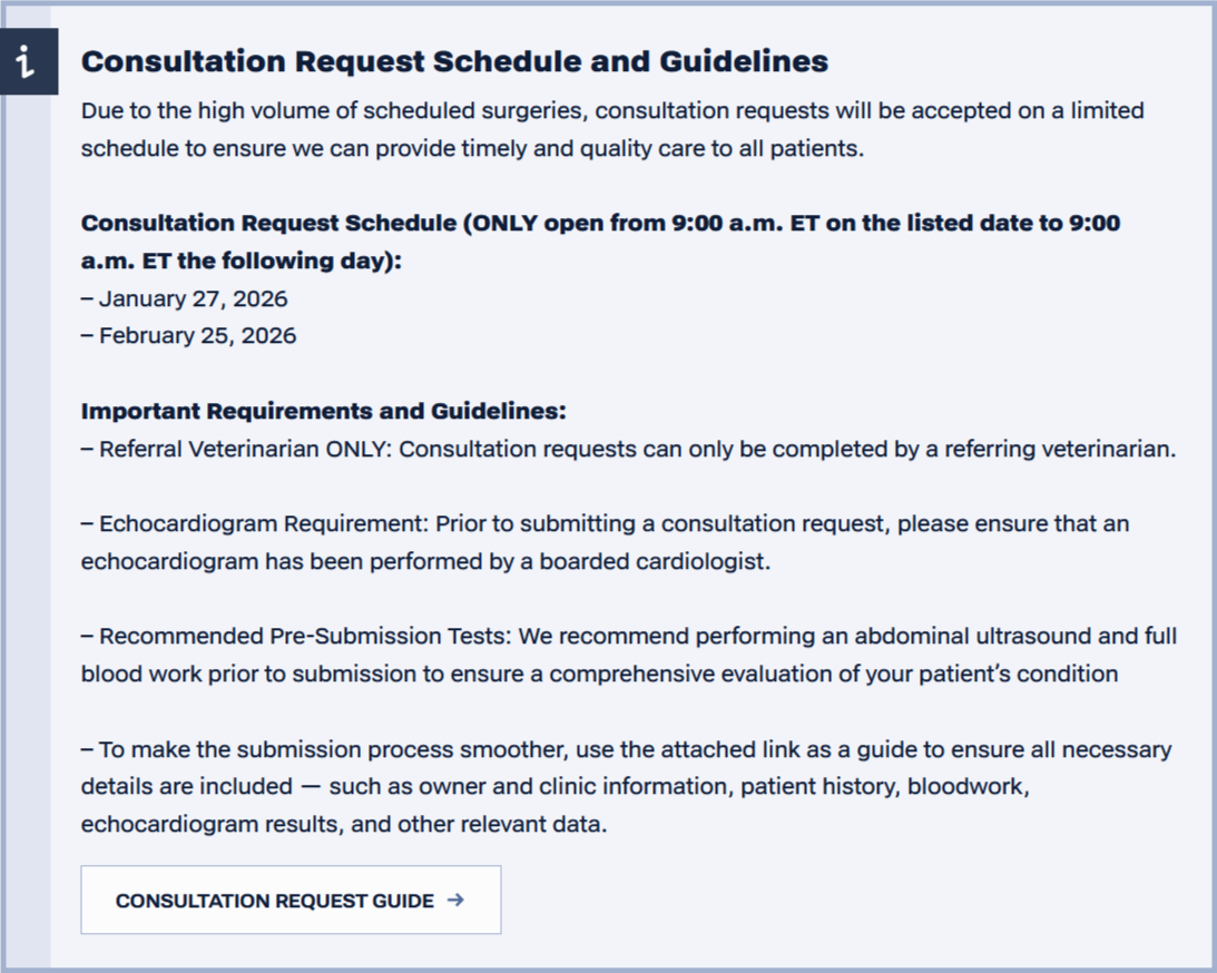 Your dog must first have a mitral valve surgery consult request submitted by a referring veterinarian. This includes echocardiogram results from a board-certified cardiologist and other key tests.